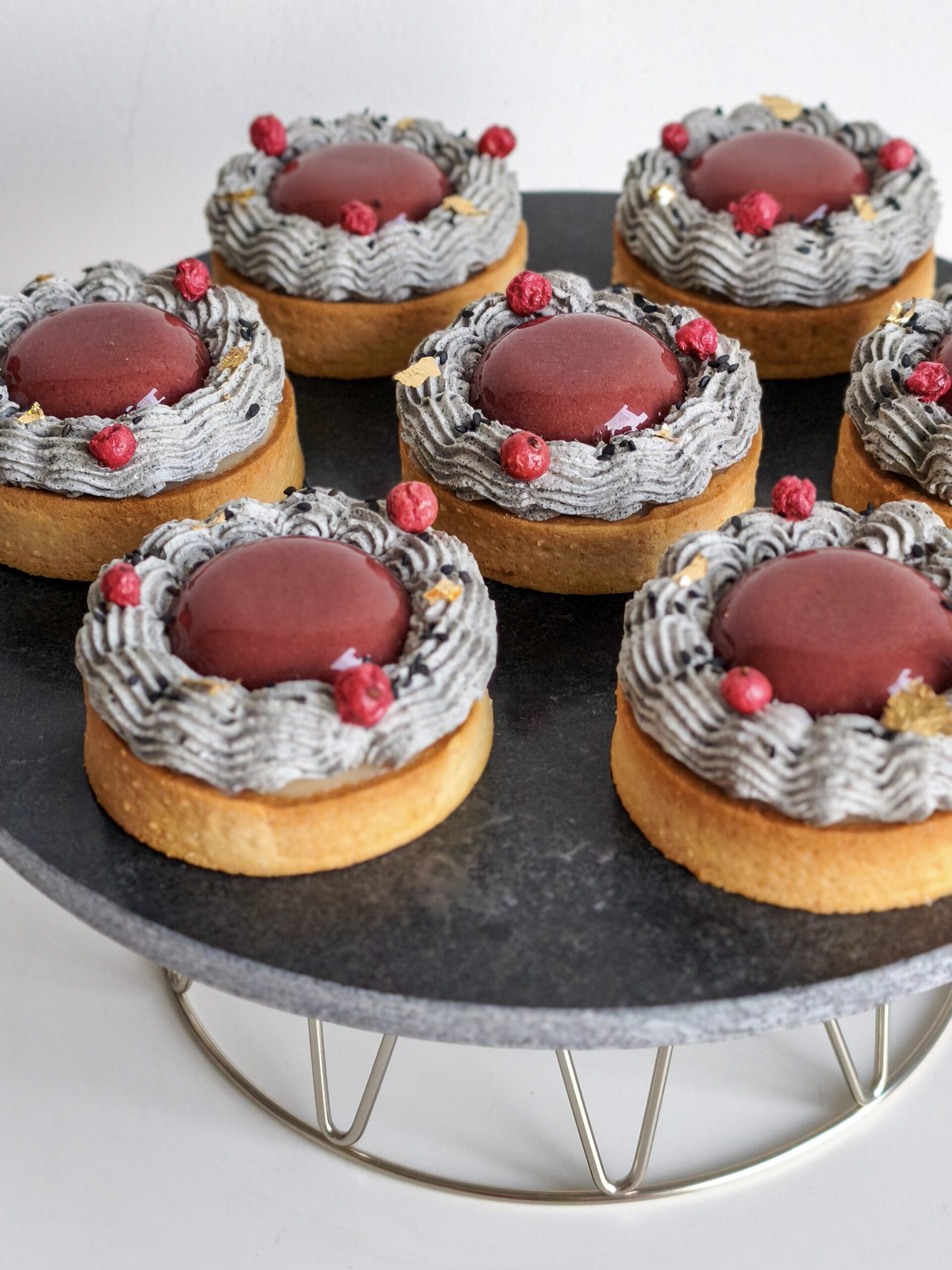 Křehká tartaletka plněná jemným krémem z bílé čokolády se šťavnatým třešňovým vkladem.