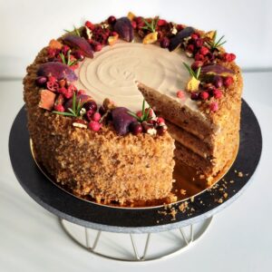 Nepečený dort s korpusem tvořeným ze směsi solených preclíků a arašídového másla vyvážený agáve sirupem.